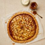 • Heat the oven to 210C (200C fan)/425F/gas 7. Put the dough on a well-floured surface and roll it out into a 35cm-diameter circle. Carefully lift this on to a lined baking tray and fold about 1½cm of the pastry’s edge over on itself all the way round. Repeat, so it now has a double folded rim. Crimp decoratively all around the edge, if you wish, then spread the spiced apple butter (or apple sauce) evenly over the base, avoiding the rim. Refrigerate the dough while you make the filling.