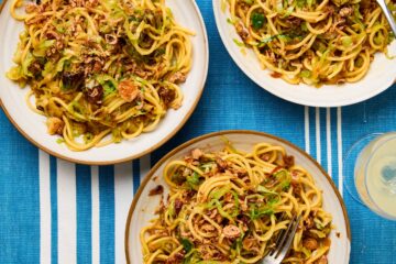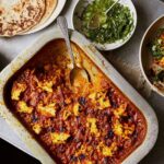 - After 40 minutes, carefully take the tray out of the oven and remove the foil. Stir the dal, then season well with sea salt. Slice the halloumi into 0.5cm pieces and layer over the top, and squeeze over the juice of the 2 zested lemons. Return to the oven for a further 15 minutes or until the edges of the tofu/paneer are beginning to turn golden, the dal is creamy and the lentils are soft.